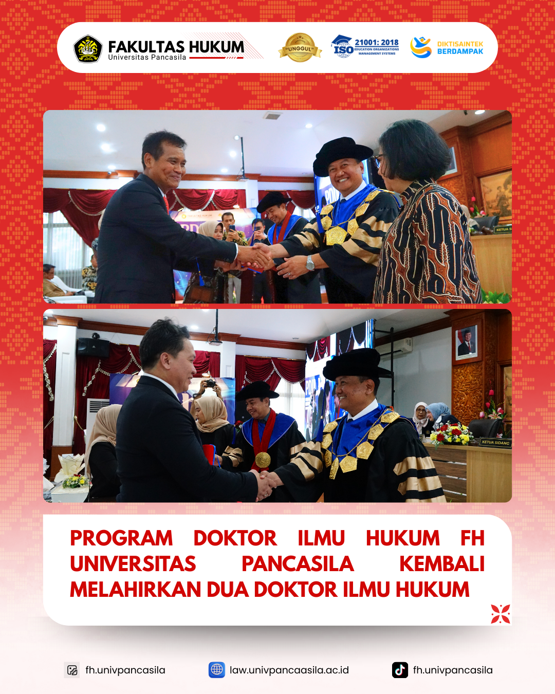 Keberhasilan ini semakin mengukuhkan Program Doktor Ilmu Hukum (PDIH) Fakultas Hukum Universitas Pancasila sebagai program unggulan dalam pengembangan pendidikan hukum tingkat doktoral di Indonesia. PDIH Fakultas Hukum Universitas Pancasila secara konsisten menghadirkan riset-riset hukum berkualitas tinggi yang relevan dengan kebutuhan nasional, sekaligus mencetak doktor hukum berintegritas, berwawasan kebangsaan, dan berdaya saing akademik. Capaian ini menjadi bukti nyata komitmen PDIH FH Universitas Pancasila dalam memberikan kontribusi akademik terhadap pengembangan pemikiran hukum, penguatan sistem peradilan, serta tata kelola hukum nasional yang berkelanjutan.