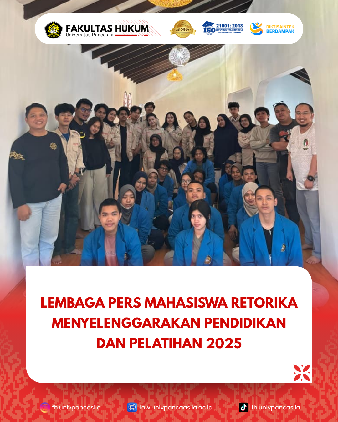 Unit Kegiatan Mahasiswa Lembaga Pers Mahasiswa Retorika di bawah binaan Bidang I Senat Mahasiswa Fakultas Hukum Universitas Pancasila menyelenggarakan Kegiatan Pendidikan dan Pelatihan pada tanggal 3—5 Oktober 2025 di Ruang Socrates, Lantai 4 Fakultas Hukum Universitas Pancasila dan Vila Nida, Jl. Padat Karya 79, Desa Batulayang, Kecamatan Cisarua, Kabupaten Bogor. Pendidikan dan Pelatihan dibuka di Ruang Simulasi Persidangan Socrates dan dilanjutkan materi pengenalan Kelembagaan Kemahasiswaan Senat Mahasiswa dan Badan Perwakilan Fakultas Hukum Keluarga Mahasiswa Univesitas Pancasila. Setelah materi pengenalan lembaga kemahasiswaan, setelah ibadah Shalat Jumat bagi yang beragama Islam dan perseketuan doa bagi agama lain, para peserta melanjutkan perjalanan menuju Vila Nida, Kabupaten Bogor. Acara dan materi selanjutnya diselenggarakan di Vila Nida dengan narasumber para alumni Fakultas Hukum Universitas Pancasila yang mengikuti LPM Retorika atau berkarir di dunia pers atau media, baik cetak maupun elektronik.